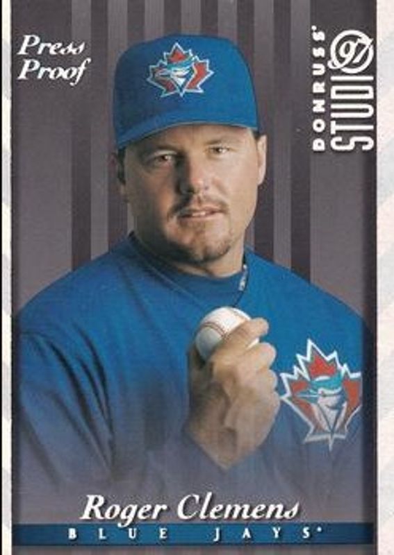 The Roger Clemens 1997 Donruss Studio #17 Press Proof Silver card is 1 of 3 Roger Clemens' card variations in the 1997 Donruss Studio set being tracked by Sports Card Investor, including Base, and Press Proof Gold.