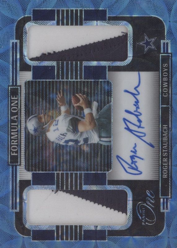 This card is 1 of 7 Roger Staubach's card variations in the 2021 One set being tracked by Sports Card Investor, including Formula One Autographs (/10), Formula One Autographs - Blue (/6), Formula One Autographs - Bronze (/5), Formula One Autographs - Gold (/3), and Formula One Autographs - Red (/4).