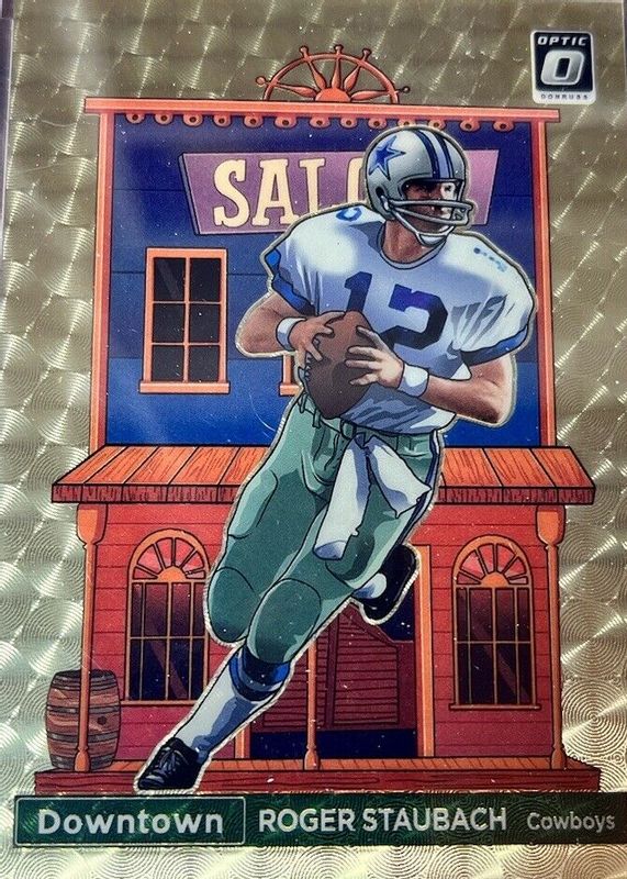 The Roger Staubach 2022 Optic #DT-RS Downtown - Gold Vinyl /1 card in Raw condition has not changed in price in the last 30 days and was last sold for $1,075.00 .
