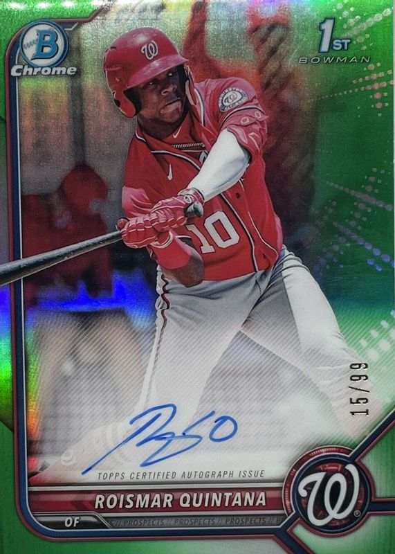 The Roismar Quintana 2022 Bowman #CPA-RQ Chrome Prospect Auto - Green Refractor /99 (1st) card in Raw condition has not changed in price in the last 30 days and was last sold for $29.27 .