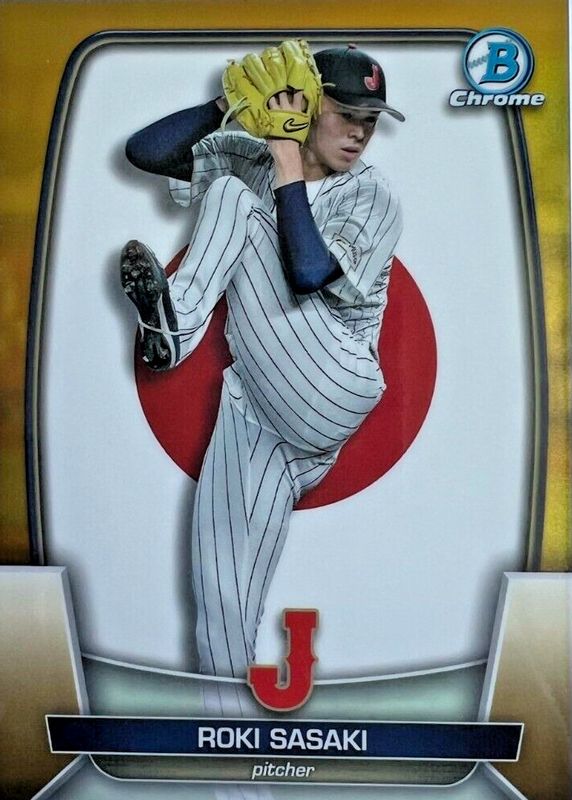 The Roki Sasaki 2023 Bowman Chrome #WBC-49 WBC Flag - Gold Refractor /50 card in Raw condition has not changed in price in the last 30 days and was last sold for $175.00 .
