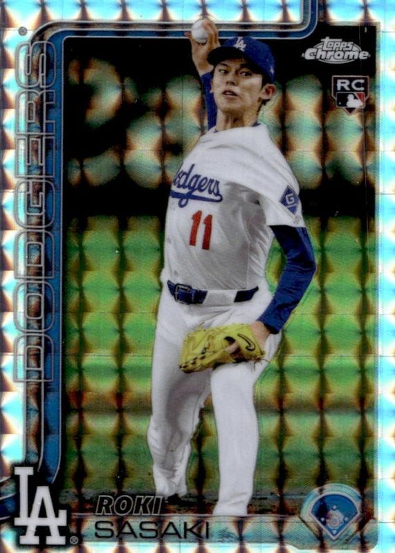 The Roki Sasaki 2025 Topps Chrome #217 Geometric Refractor Rookie card in Raw condition has not changed in price in the last 30 days and was last sold for $10.49 .