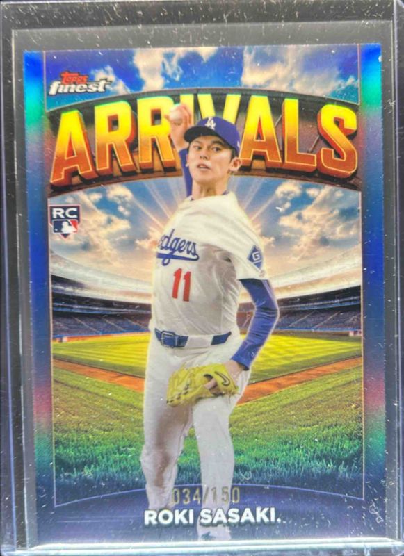 The Roki Sasaki 2025 Topps Finest #A-11 Arrivals - Sky Blue Refractor /150 Rookie card is 1 of 154 Roki Sasaki's card variations in the 2025 Topps Finest set being tracked by Sports Card Investor, including Common, Rare, Uncommon, Common - Checkerboard Refractor, and Common - Refractor.