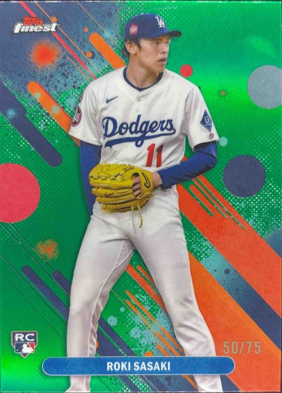 The Roki Sasaki 2025 Topps Finest #40 Base Common - Green Refractor /75 Rookie card is 1 of 154 Roki Sasaki's card variations in the 2025 Topps Finest set being tracked by Sports Card Investor, including Common, Rare, Uncommon, Common - Checkerboard Refractor, and Common - Refractor.