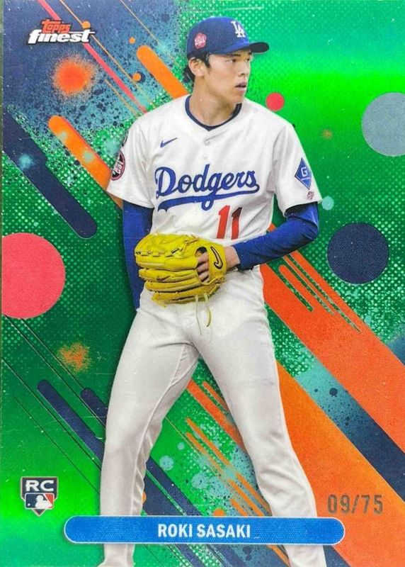 The Roki Sasaki 2025 Topps Finest #40 Common - Green Refractor /75 Rookie card in Raw condition has moved up $5.00 (+16.7%) in the last 30 days and was last sold for $35.00 .