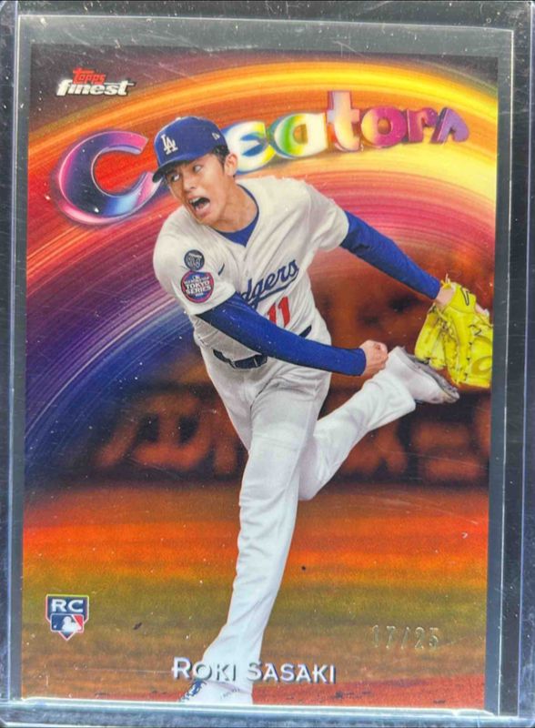 The Roki Sasaki 2025 Topps Finest #C-16 Creators - Orange Refractor /25 Rookie card is 1 of 154 Roki Sasaki's card variations in the 2025 Topps Finest set being tracked by Sports Card Investor, including Common, Rare, Uncommon, Common - Checkerboard Refractor, and Common - Refractor.