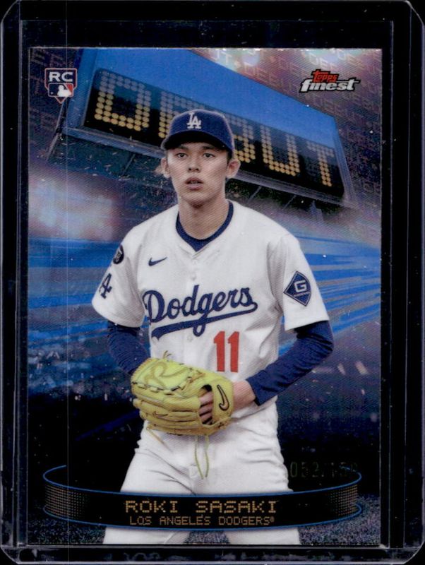 The Roki Sasaki 2025 Topps Finest #D-28 Debut - Sky Blue Refractor /150 Rookie card is 1 of 154 Roki Sasaki's card variations in the 2025 Topps Finest set being tracked by Sports Card Investor, including Common, Rare, Uncommon, Common - Checkerboard Refractor, and Common - Refractor.