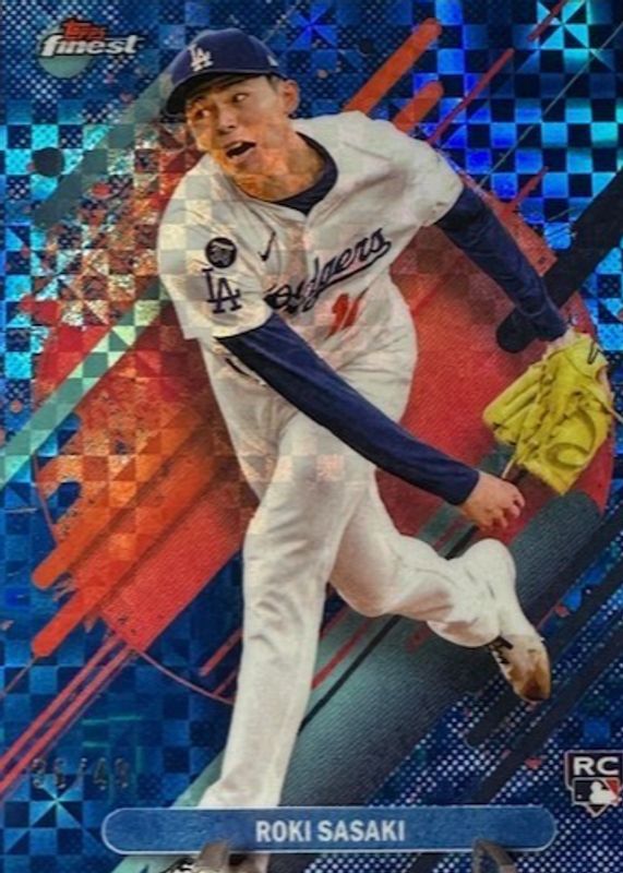 The Roki Sasaki 2025 Topps Finest #288 Rare - Blue Checkerboard Refractor /49 Rookie card in Raw condition has moved down -$34.99 (-38.9%) in the last 30 days and was last sold for $55.00 .