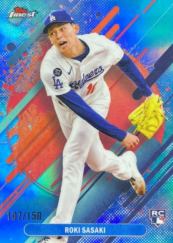 The Roki Sasaki 2025 Topps Finest #288 Rare - Sky Blue Refractor /150 Rookie card in Raw condition has moved down -$12.28 (-27.3%) in the last 30 days and was last sold for $32.72 .
