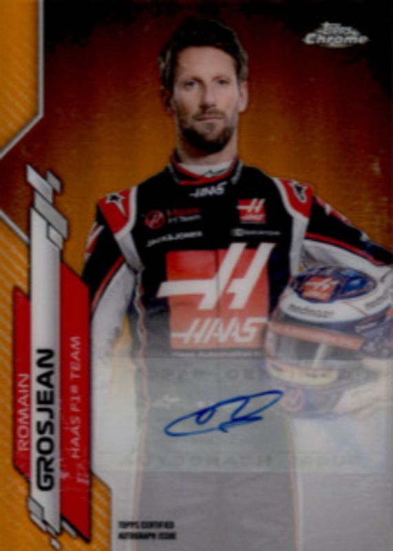 The Romain Grosjean 2020 Topps Chrome Formula 1 #F1A-RG Autographs - Orange Refractor /25 card in Raw condition has not changed in price in the last 30 days and was last sold for $129.50 .