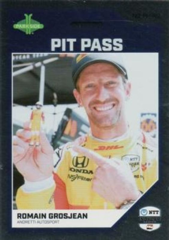 The Romain Grosjean 2024 Parkside IndyCar Premier Edition #PP-RG Pit Pass card is 1 of 45 Romain Grosjean's card variations in the 2024 Parkside IndyCar Premier Edition set being tracked by Sports Card Investor, including #157 Base, #26 Base, #25 Base, #112 Base, and #112 Blue Foil.