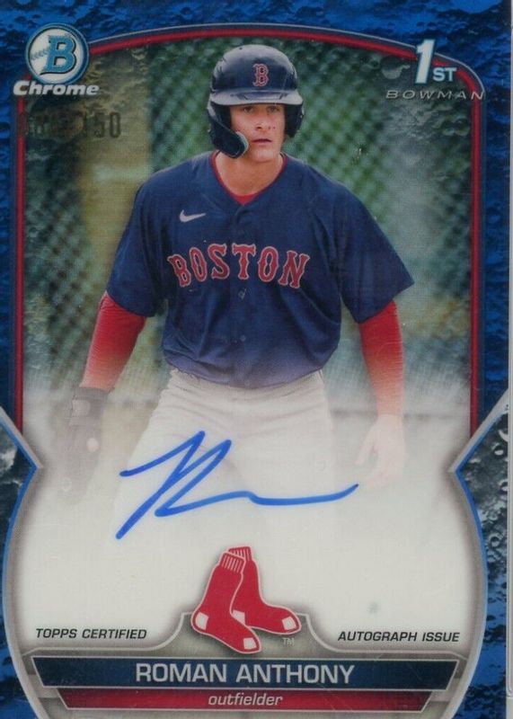 The Roman Anthony 2023 Bowman #CPA-RA Chrome Prospect Auto - Blue Lunar Crater Refractor /150 (1st) card in Raw condition has not changed in price in the last 30 days and was last sold for $505.00 .