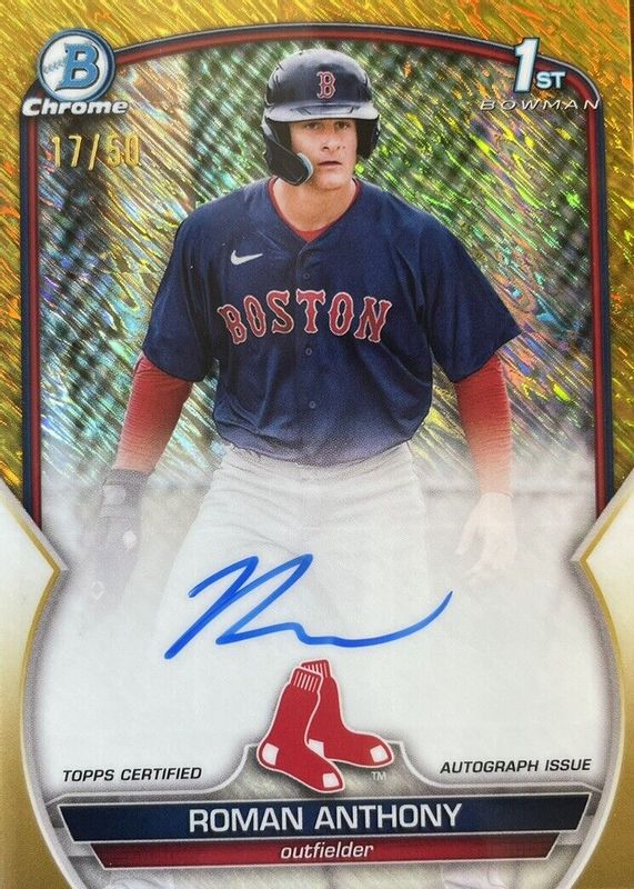 The Roman Anthony 2023 Bowman #CPA-RA Chrome Prospect Auto - Gold Shimmer Refractor /50 (1st) card in Raw condition has not changed in price in the last 30 days and was last sold for $1,500.00 .