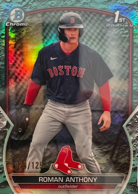 This card is 1 of 49 Roman Anthony's card variations in the 2023 Bowman set being tracked by Sports Card Investor, including Chrome Prospects (1st), Chrome Prospects - Atomic Refractor (1st), Chrome Prospects - Lunar Glow Refractor (1st), Chrome Prospects - Pearl Refractor (1st), and Chrome Prospects - Refractor /499 (1st).