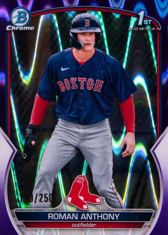 The Roman Anthony 2023 Bowman #BCP-71 Chrome Prospects - Purple RayWave Refractor /250 (1st) card in Raw condition has not changed in price in the last 30 days and was last sold for $170.00 .