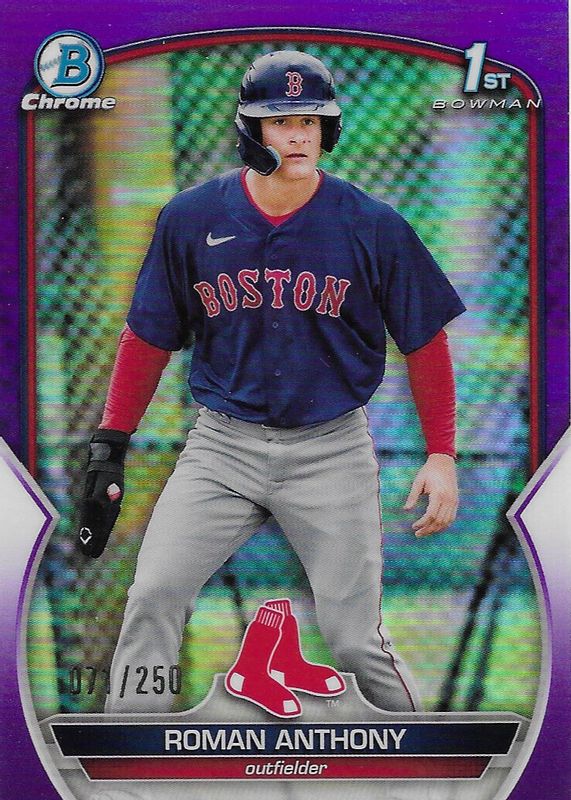 The Roman Anthony 2023 Bowman #BCP-71 Chrome Prospects - Purple Refractor /250 (1st) card in Raw condition has moved up $50.00 (+40.0%) in the last 30 days and was last sold for $175.00 .