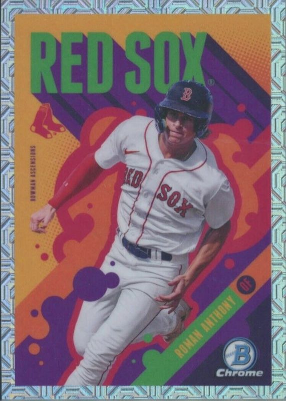 This card is 1 of 4 Roman Anthony's card variations in the 2024 Bowman Chrome Mega Box set being tracked by Sports Card Investor, including Bowman Ascensions - Orange Mojo Refractor /25, Bowman Ascensions - Red Mojo Refractor /5, and Bowman Ascensions - Black Mojo Refractor /1.