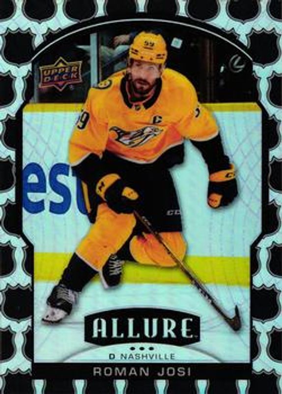 The Roman Josi 2020 Upper Deck Allure #19 2005 Shield card is 1 of 40 Roman Josi's card variations in the 2020 Upper Deck Allure set being tracked by Sports Card Investor, including Base, Black Rainbow, Blue China, Leopard, and Magenta.