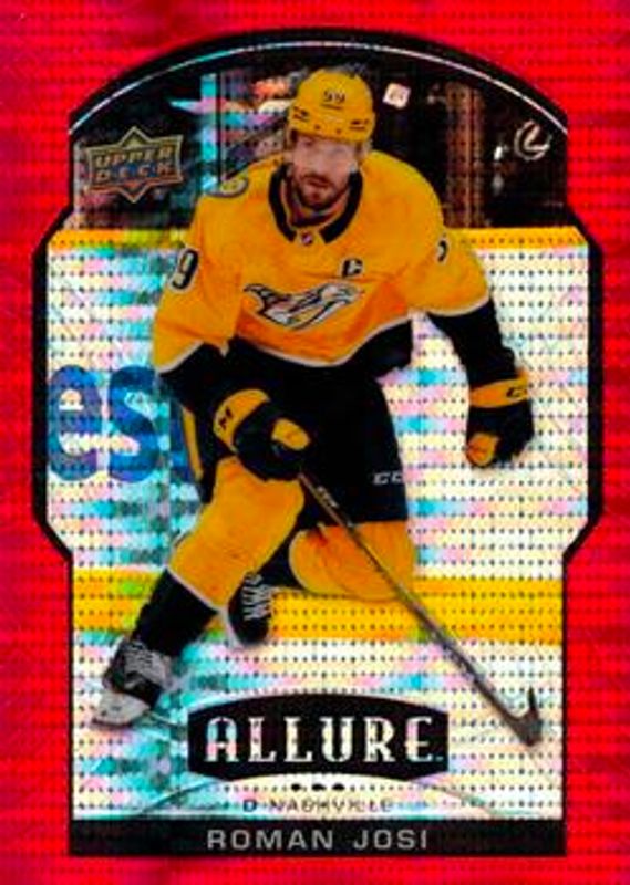 The Roman Josi 2020 Upper Deck Allure #19 Red Rainbow card is 1 of 40 Roman Josi's card variations in the 2020 Upper Deck Allure set being tracked by Sports Card Investor, including Base, 2005 Shield, Black Rainbow, Blue China, and Leopard.