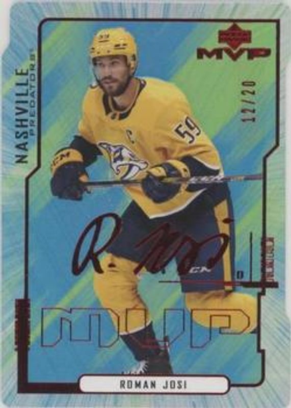 The Roman Josi 2020 Upper Deck MVP #85 Colors & Contours Green /20 card is 1 of 19 Roman Josi's card variations in the 2020 Upper Deck MVP set being tracked by Sports Card Investor, including Base, Blue, Gold Script, Puzzle Backs, and Silver Script.
