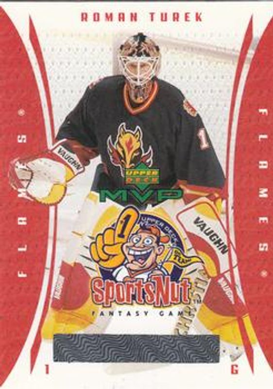 The Roman Turek 2003 Upper Deck MVP #SN14 SportsNut card is 1 of 6 Roman Turek's card variations in the 2003 Upper Deck MVP set being tracked by Sports Card Investor, including Base, Silver Script /150, Gold Script /25, Red Script /25, and Jumbos /299.