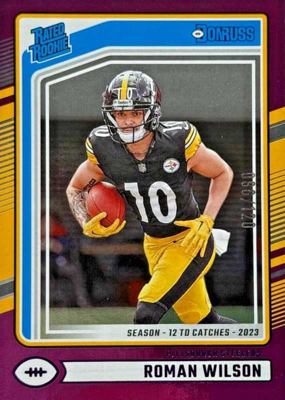 The Roman Wilson 2024 Donruss #348 Season Stat Line (/120) Rookie card in Raw condition has not changed in price in the last 30 days and was last sold for $4.65 .