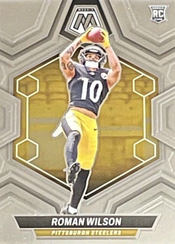 The Roman Wilson 2024 Mosaic #369 Base Rookie card in Raw condition has moved up $0.53 (+54.6%) in the last 30 days and was last sold for $1.50 .