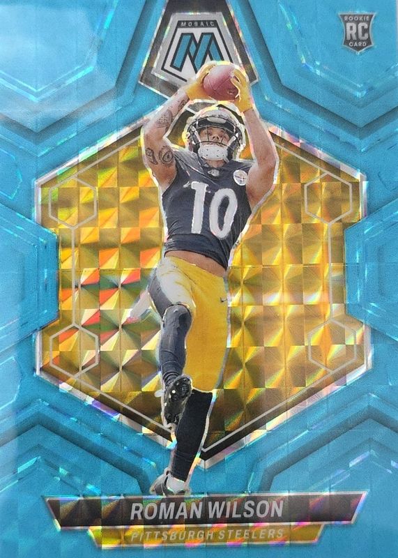 The Roman Wilson 2024 Mosaic #369 Blue Fluorescent /15 Rookie card in Raw condition has not changed in price in the last 30 days and was last sold for $30.00 .