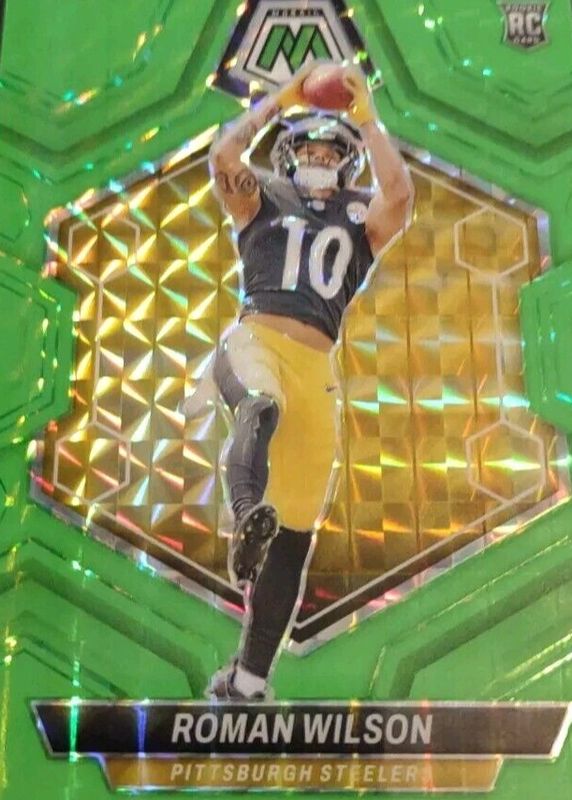 The Roman Wilson 2024 Mosaic #369 Green Fluorescent /10 Rookie card in Raw condition has not changed in price in the last 30 days and was last sold for $35.00 .