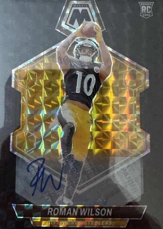 The Roman Wilson 2024 Mosaic #369 Rookie Autographs - Black /1 card in Raw condition has not changed in price in the last 30 days and was last sold for $425.00 .