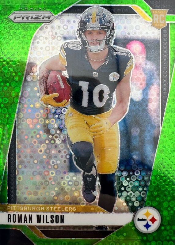 The Roman Wilson 2024 Prizm #384 No Huddle Neon Green /10 Rookie card in Raw condition has not changed in price in the last 30 days and was last sold for $51.00 .