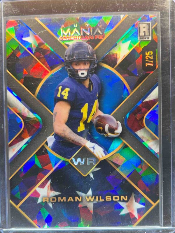 The Roman Wilson 2024 Wild Card Automania American Football Preview #AMATP-RW Triangle Crystal Holographic American Flag /25 Rookie card is 1 of 220 Roman Wilson's card variations in the 2024 Wild Card Automania American Football Preview set being tracked by Sports Card Investor, including Circle Rainbow American Flag /25, Circle Sparkle American Flag /25, Diamond Mojo American Flag /25, Diamond Rainbow American Flag /25, and Hex Lazers American Flag /25.