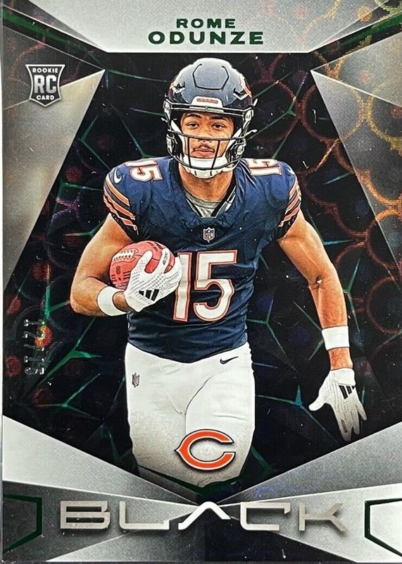 The Rome Odunze 2024 Black #185 Emerald /15 Rookie card in Raw condition has not changed in price in the last 30 days and was last sold for $15.01 .