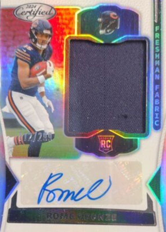 The Rome Odunze 2024 Certified #FMS-ROE Freshman Fabric Signatures - Mirror (/299) Rookie card in Raw condition has moved up $10.00 (+29.4%) in the last 30 days and was last sold for $44.00 .