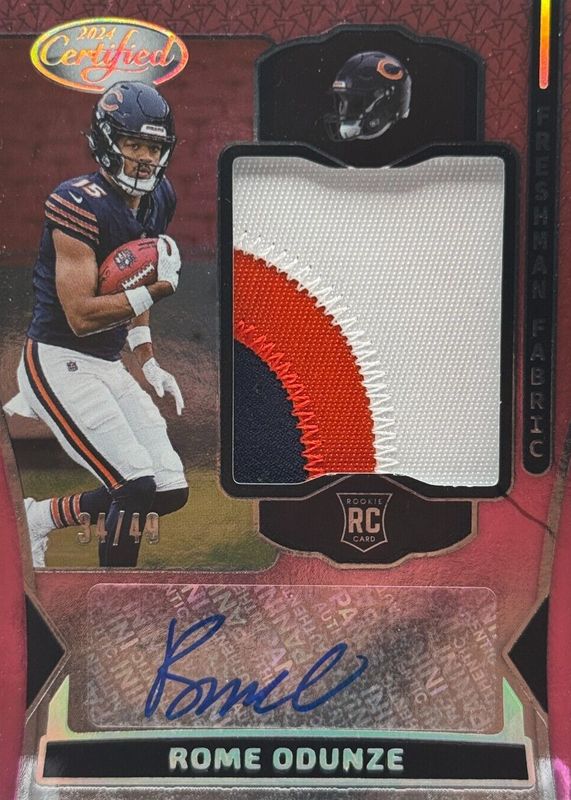 The Rome Odunze 2024 Certified #FMS-ROE Freshman Fabric Signatures - Mirror Pink Etch /49 Rookie card in Raw condition has not changed in price in the last 30 days and was last sold for $55.00 .