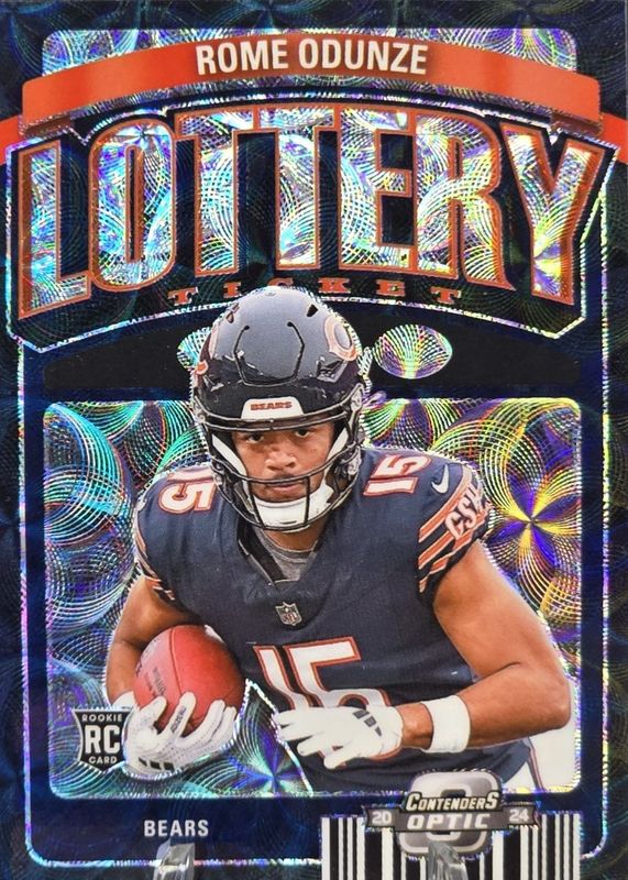The Rome Odunze 2024 Contenders Optic #LT-ROE Lottery Ticket - Black Scope /25 Rookie card in Raw condition has not changed in price in the last 30 days and was last sold for $67.99 .