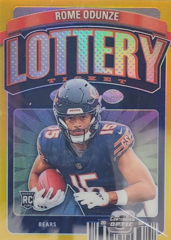 The Rome Odunze 2024 Contenders Optic #LT-ROE Lottery Ticket - Gold /10 Rookie card in Raw condition has not changed in price in the last 30 days and was last sold for $75.00 .