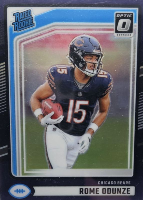 The Rome Odunze 2024 Donruss #309 Optic Preview - Purple /50 Rookie card in Raw condition has not changed in price in the last 30 days and was last sold for $36.00 .