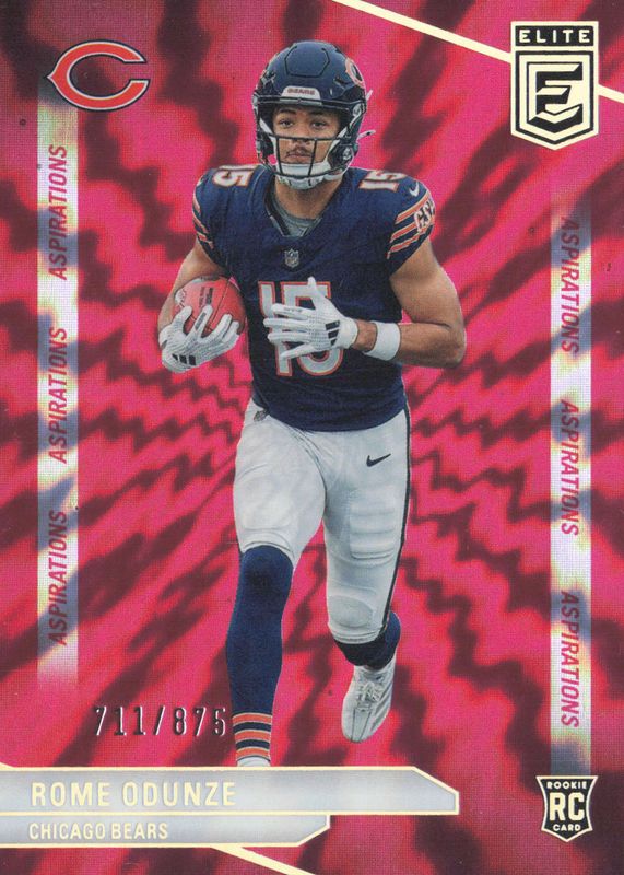 The Rome Odunze 2024 Elite #103 Aspirations Shimmer /875 Rookie card in Raw condition has moved up $4.70 (+364%) in the last 30 days and was last sold for $5.99 .