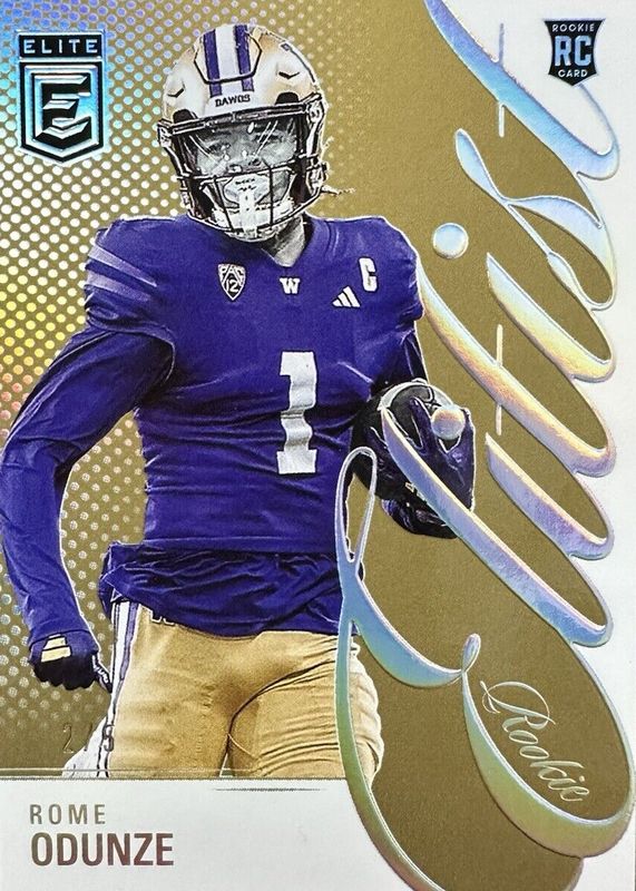 The Rome Odunze 2024 Elite #11 Rookie Elitist - Gold /5 card in Raw condition has not changed in price in the last 30 days and was last sold for $79.95 .