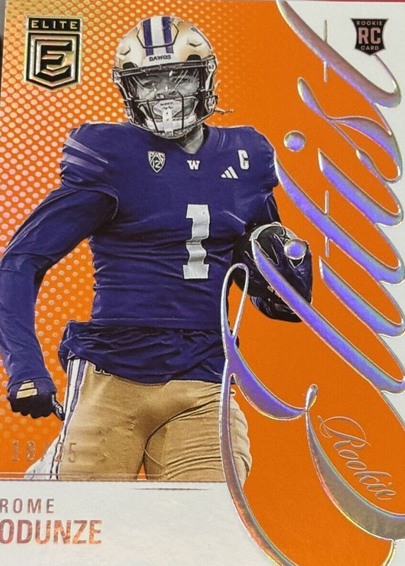 The Rome Odunze 2024 Elite #11 Rookie Elitist - Orange /25 card in Raw condition has not changed in price in the last 30 days and was last sold for $8.50 .