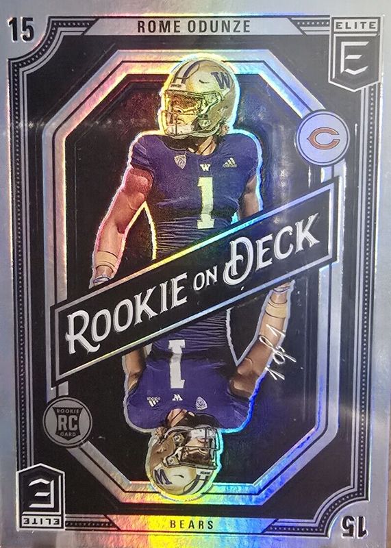 The Rome Odunze 2024 Elite #2 Rookie on Deck - Black /1 card in Raw condition has not changed in price in the last 30 days and was last sold for $799.00 .