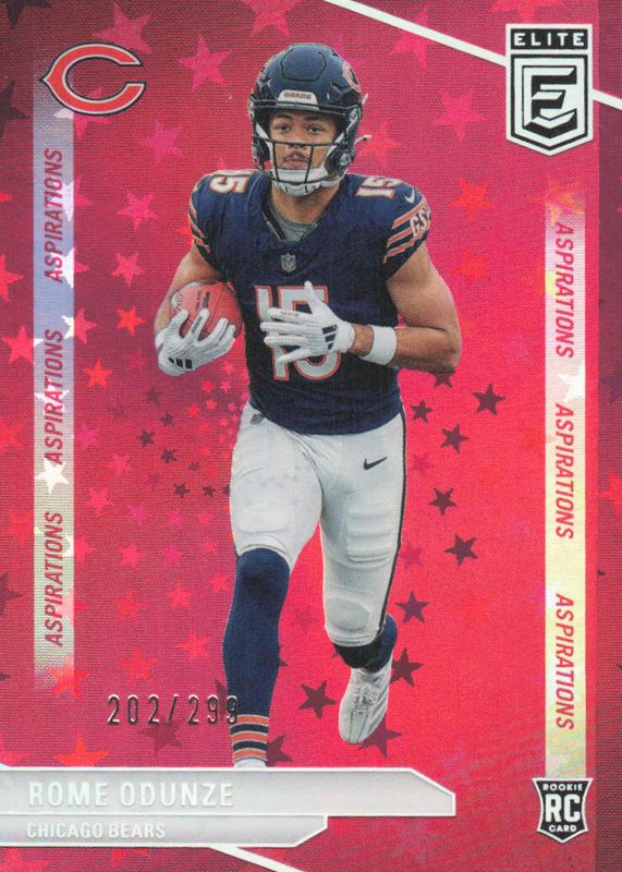 This card is 1 of 56 Rome Odunze's card variations in the 2024 Elite set being tracked by Sports Card Investor, including Base Rookie /999, Aspirations (/85), Green Disco, Pink, and Status (/15).