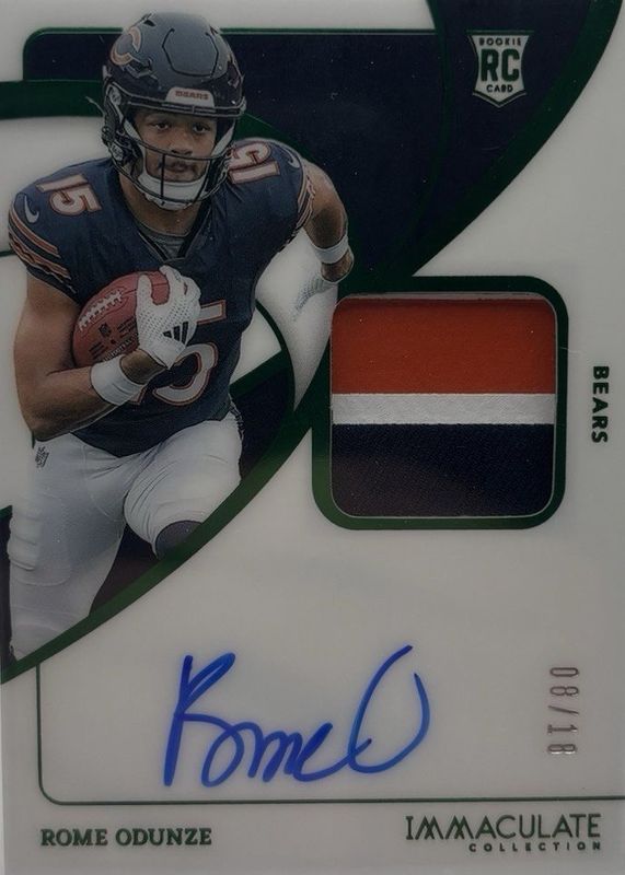 The Rome Odunze 2024 Immaculate #104 Rookie Patch Auto - Emerald /18 card in Raw condition has not changed in price in the last 30 days and was last sold for $109.00 .