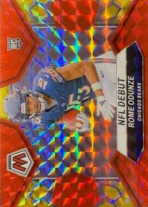 The Rome Odunze 2024 Mosaic #281 NFL Debut - Choice Fusion Red & Yellow /80 Rookie card in Raw condition has not changed in price in the last 30 days and was last sold for $22.00 .