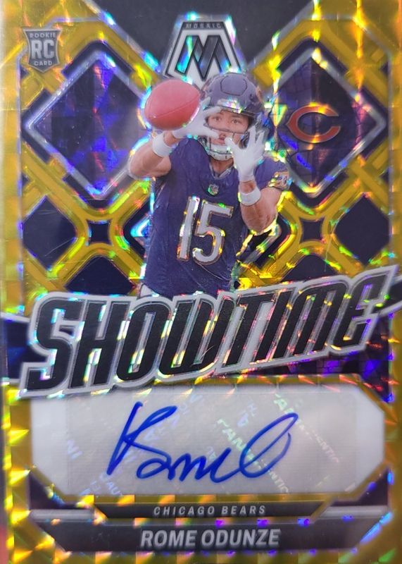 The Rome Odunze 2024 Mosaic #SS-ROE Showtime Signatures - Gold /10 Rookie card in Raw condition has not changed in price in the last 30 days and was last sold for $224.50 .