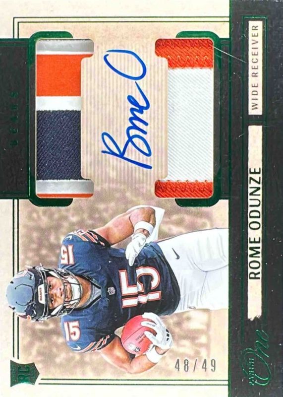 This card is 1 of 62 Rome Odunze's card variations in the 2024 One set being tracked by Sports Card Investor, including One Originals, Rookie Dual Patch Autographs /199, Rookie Patch Auto /199, Day One Autographs /99, and Franchise Future Fabric Autographs /99.