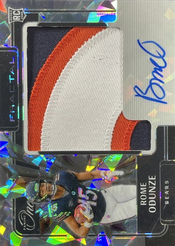 The Rome Odunze 2024 One #394 Rookie Fractal Patch Autographs /50 card in Raw condition has not changed in price in the last 30 days and was last sold for $113.50 .
