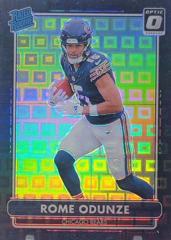 This card is 1 of 115 Rome Odunze's card variations in the 2024 Optic set being tracked by Sports Card Investor, including Base, Blue Hyper, Blue Scope, Green Hyper, and Green Velocity.