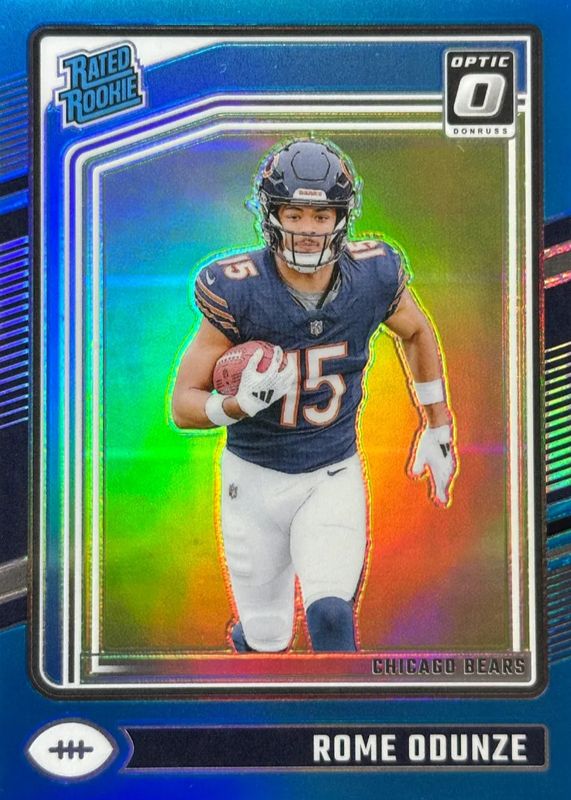 The Rome Odunze 2024 Optic #286 Aqua /299 Rookie card in Raw condition has moved up $6.50 (+61.9%) in the last 30 days and was last sold for $17.00 .